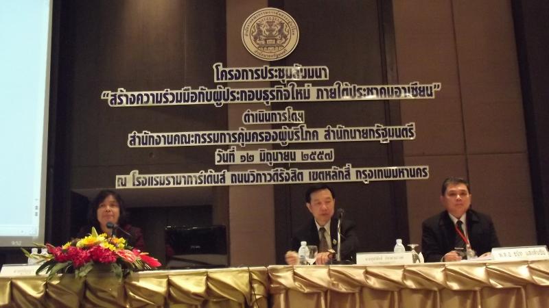เมื่อวันที่ ๑๒ มิถุนายน ๒๕๕๗  กองคุ้มครองผู้บริโภคด้านสัญญาได้ดำเนินการจัดสัมนาโครงการสร้างความร่วมมือกับผู้ประกอบธุรกิจมิติใหม่ ภายใต้ประชาคมอาเซียน  ณ โรงแรมรามาการ์เด้นท์ ถนนวิภาวดีรังสิต เขตหลักสี่ กรุงเทพมหานคร โดยมีผู้สนใจเข้าร่วมประชุมสัมมนา จำนวนทั้งสิ้น ๑๒๐ ราย แยกเป็น ผู้ประกอบธุรกิจขายรถยนต์ที่มีการจอง จำนวน ๔๔ ราย ผู้ประกอบธุรกิจให้บริการซ่อมรถยนต์ จำนวน ๓๑ ราย เจ้าหน้าที่ภาครัฐ จำนวน ๓๐ ราย และสื่อมวลชน จำนวน ๑๕ ราย โดยเนื้อหาในการบรรยายส่วนใหญ่จะเป็นเรื่องเกี่ยวกับการดำเนินการด้านสัญญา เช่น นโยบายของสำนักงานคณะกรรมการคุ้มครองผู้บริโภคต่อการดำเนินการแก้ไขปัญหาเรื่องร้องเรียนที่เกี่ยวกับด้านการจองรถยนต์และให้บริการซ่อมรถยนต์ การจัดทำสัญญาจองรถยนต์หรือหลักฐานการรับเงินให้บริการซ่อมรถยนต์ตามประกาศคณะกรรมการว่าด้วยสัญญาฯ หรือการดำเนินคดีหรือการแก้ไขปัญหาเรื่องร้องเรียนของกองบังคับการปราบปราบการกระทำความผิดเกี่ยวกับการคุ้มครองผู้บริโภค (ตำรวจ ปคบ.)โดยใช้ระยะเวลาในการจัดประชุมสัมมนาทั้งสิ้น ตั้งแต่เวลา ๐๙.๓๐-๑๕.๓๐ นาฬิกา ซึ่งผู้เข้าร่วมประชุมสัมมนาส่วนใหญ่มีความพึงพอใจต่อผู้ที่เป็นวิทยากร เนื้อหาสาระที่ให้ความรู้ ตลอดจนสถานที่ในการจัดประชุมสัมมนา (โดยการให้ผู้เข้าร่วมประชุมสัมมนากรอกแบบวัดความพึงพอใจ) อีกทั้ง มีความรู้ความเข้าใจต่อการปฏิบัติตามประกาศคณะกรรมการสัญญาฯ มากขึ้น และรับว่าจะดำเนินการแก้ไข แบบฟอร์มให้เป็นไปตามที่ประกาศฯ กำหนด (โดยการประเมินจากแบบประเมินวัดความรู้ความเข้าใจต่อประกาศคณะกรรมการ ว่าด้วยสัญญาฯ)ทั้งนี้ ได้กำหนดระยะเวลาให้ผู้ประกอบธุรกิจดำเนินการแก้ไขแบบฟอร์มให้ถูกต้อง รวมทั้ง แจ้งให้ผู้แทนจำหน่ายของตนดำเนินการให้ถูกต้อง ภายใน ๑ เดือน