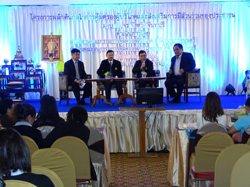 สำนักงานคณะกรรมการคุ้มครองผู้บริโภค จัดทำโครงการผลักดันกลไกการคุ้มครองผู้บริโภคและส่งเสริมการมีส่วนร่วมของประชาชน สคบ. สัญจรจังหวัดจันทบุรี โดยร่วมกับคณะทำงานประจำจังหวัดจันทบุรี ลงพื้นที่ตรวจสอบและให้ความรู้แก่ผู้ประกอบธุรกิจ ในวันที่ 20 สิงหาคม 2558 เพื่อปฏิบัติให้ถูกต้องตามพระราชบัญญัติคุ้มครองผู้บริโภคฯ ด้านโฆษณา ด้านฉลากสินค้า และด้านสัญญา และในวันที่ 21 สิงหาคม 2558 จัดให้มีการประชุมสัมมนาให้ความรู้เรื่องการคุ้มครองผู้บริโภคแก่ กำนัน ผู้ใหญ่บ้าน เครือข่ายประชาชน เพื่อให้เข้ามามีส่วนร่วมในการคุ้มครองสิทธิผู้บริโภคในการรับเรื่องราวร้องทุกข์จากผู้บริโภคผ่านเครือข่ายกำนัน ผู้ใหญ่บ้าน เทศบาล อบต. ด้วย "โปรแกรมประยุกต์ (Application) รับเรื่องราวร้องทุกข์จากผู้บริโภคออนไลน์” ซึ่งจะเป็นการอำนวยความสะดวกให้แก่ประชาชนที่ถูกละเมิดสิทธิผู้บริโภค