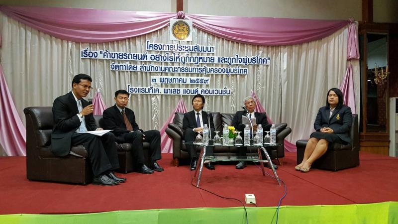 วันที่ 3 พฤษภาคม 2559 เลขาธิการคณะกรรมการคุ้มครองผู้บริโภค มอบหมายให้นายสุวิทย์ วิจิตรโสภา ผู้อำนวยการกองคุ้มครองผู้บริโภคด้านสัญญา เป็นประธานในพิธีเปิดโครงการประชุมสัมมนา เรื่อง "ค้าขายรถยนต์อย่างไรให้ถูกกฎหมาย และถูกใจผู้บริโภค” ณ โรงแรม ที เค พาเลซ โฮเทล แอนด์ คอนเวนชั่น กรุงเทพมหานคร ภายในงานมีการสัมมนา เรื่อง "ค้าขายรถยนต์อย่างไร ให้ถูกกฎหมายและถูกใจผู้บริโภค" พร้อมแบ่งกลุ่ม Workshop เป็น 4 กลุ่ม โดยมีวิทยากรจากสคบ.ให้ความรู้ในเรื่องต่างๆ ดังนี้ กลุ่มที่ 1. เรื่อง การทำสัญญาจองรถยนต์ 2. การทำสัญญาเช่าซื้อ 3. รถยนต์ใช้แล้ว และ 4. การสื่อสารข้อมูลของพนักงานขาย ผู้เข้าร่วมสัมมนาประกอบด้วยผู้ประกอบธุรกิจซื้อขายรถยนต์ ดีลเลอร์รถยนต์ เจ้าของเต็นท์รถยนต์จำนวน 200 คน