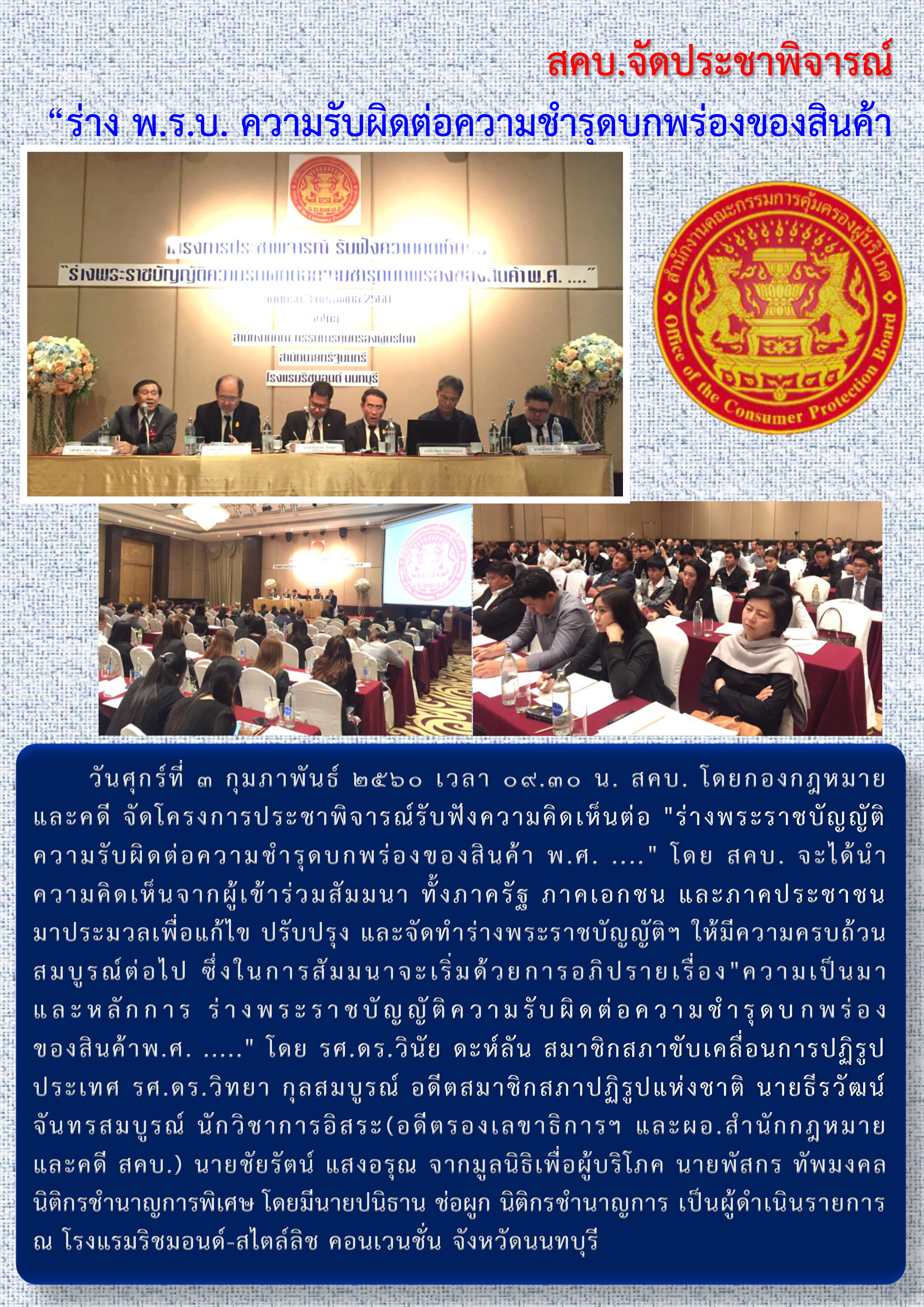 สคบ.จัดประชาพิจารณ์ "ร่าง พ.ร.บ. ความผิดต่อความชำรุดบกพร่องของสินค้า"