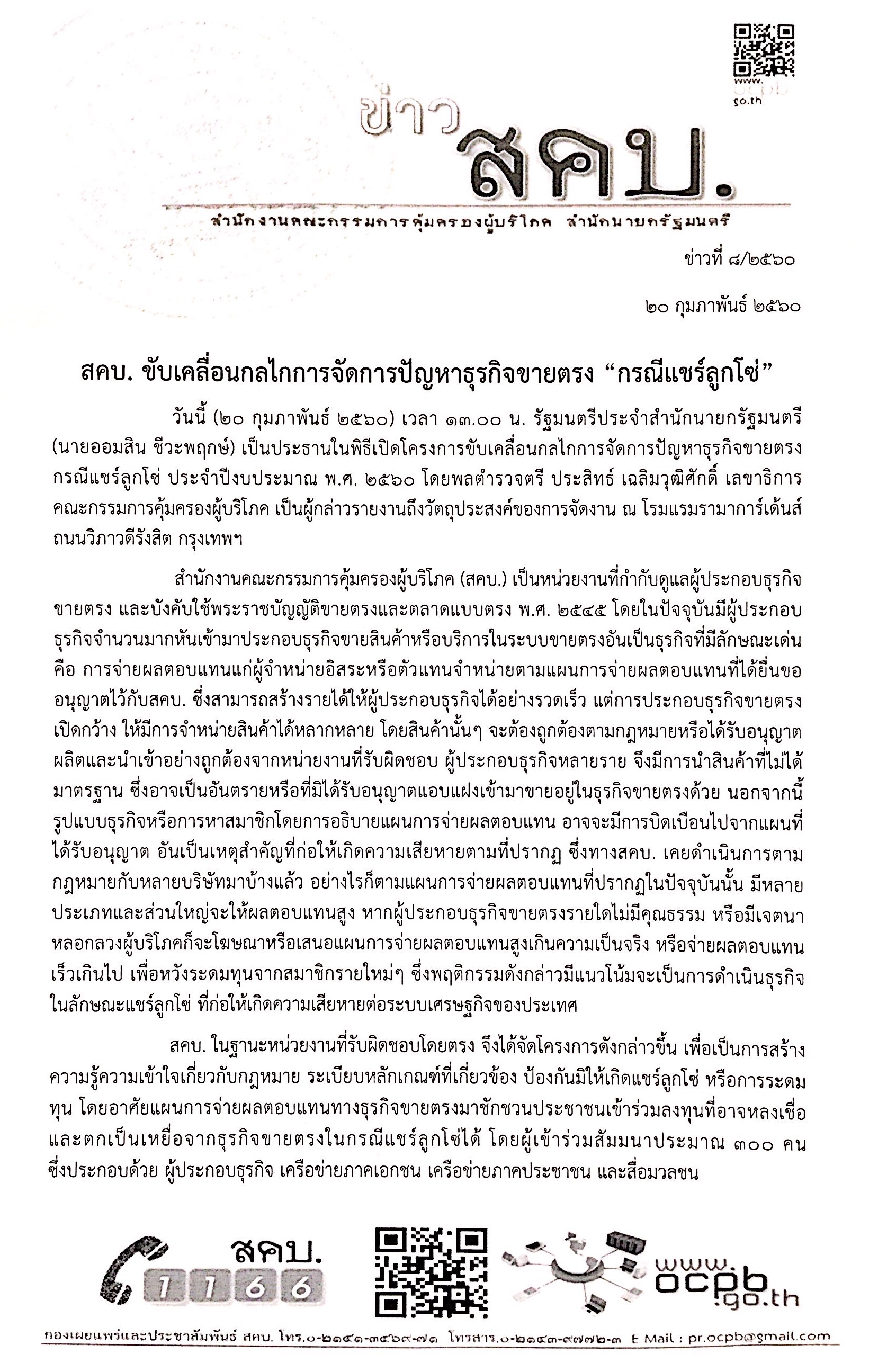 สคบ. ขับเคลื่อนกลไกการจัดการปัญหาธุรกิจขายตรง "กรณีแชร์ลูกโซ่"