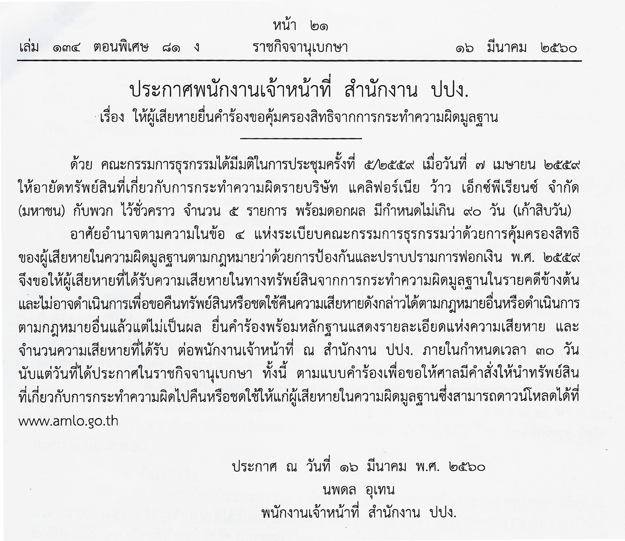 สำนักงานป้องกันและปราบปรามการฟอกเงินได้ประกาศในราชกิจจานุเบกษา เมื่อวันที่ ๑๖ มีนาคม ๒๕๖๐ ให้ผู้เสียหายที่ได้รับความเสียหายในทางทรัพย์สินจากการกระทำความผิดรายบริษัท แคลิฟอร์เนีย ว้าว เอ็กซ์พีเรียนซ์ จำกัด (มหาชน) กับพวก และไม่อาจดำเนินการเพื่อขอคืนทรัพย์สินหรือชดใช้คืนความเสียหายดังกล่าวได้ตามกฎหมายอื่นหรือดำเนินการตามกฎหมายอื่นแล้วแต่ไม่เป็นผล ยื่นคำร้องพร้อมหลักฐานแสดงรายละเอียดแห่งความเสียหาย และจำนวนความเสียหายที่ได้รับต่อพนักงานเจ้าหน้าที่ ณ สำนักงาน ปปง. ภายในกำหนด ๓๐ วัน นับแต่วันที่ได้ประกาศในราชกิจจานุเบกษา