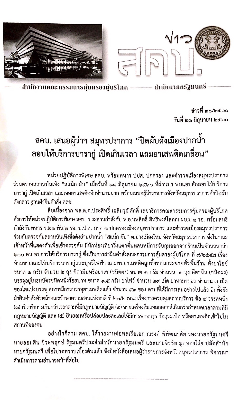 สคบ. เสนอผู้ว่าฯ สมุทรปราการ "ปิดผับดังเมืองปากน้ำ ลอบให้บริการบารากู่ เปิดเกินเวลา แถมยาเสพติดเกลื่อน"