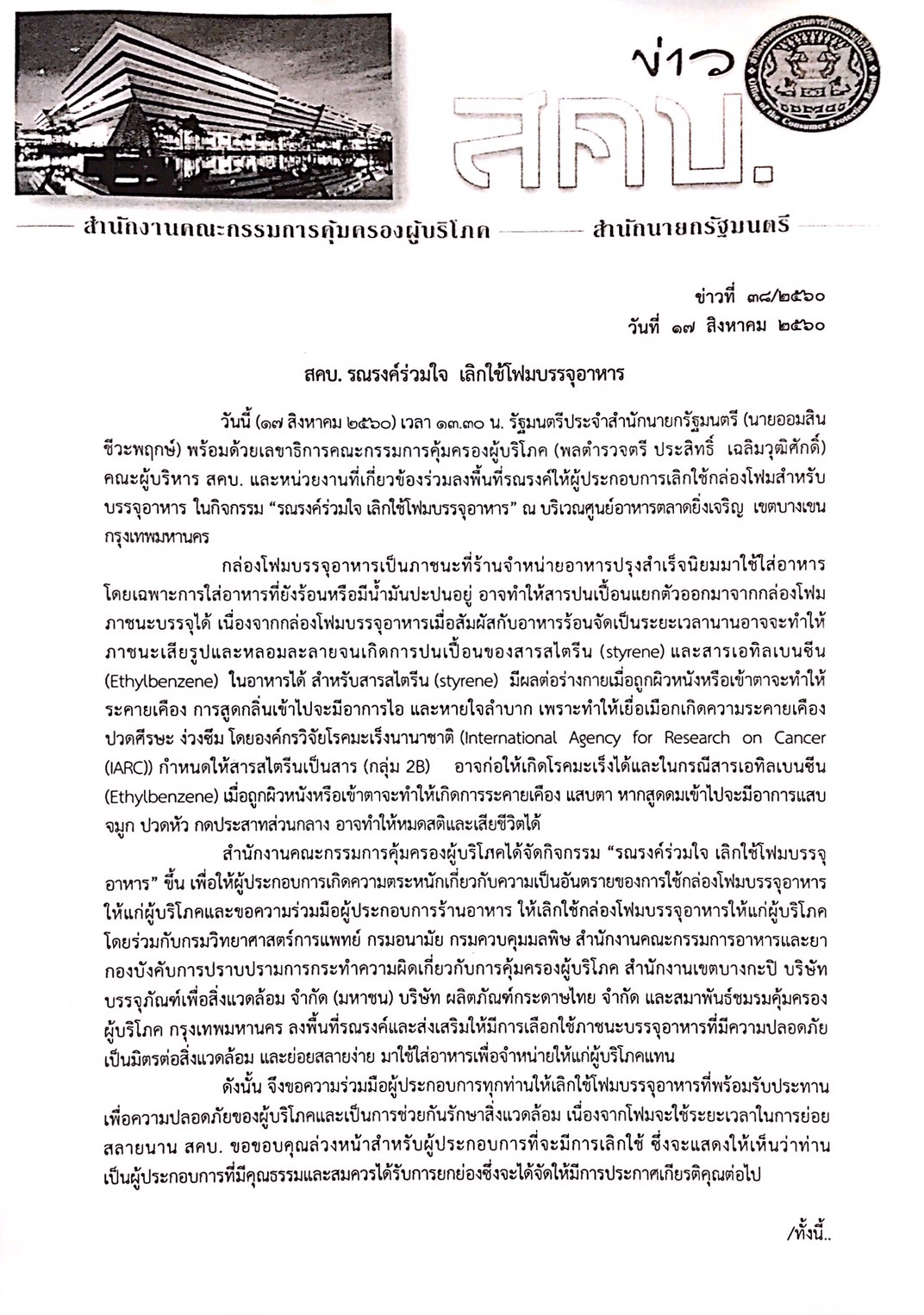 สคบ. รณรงค์ร่วมใจ เลิกใช้โฟมบรรจุอาหาร