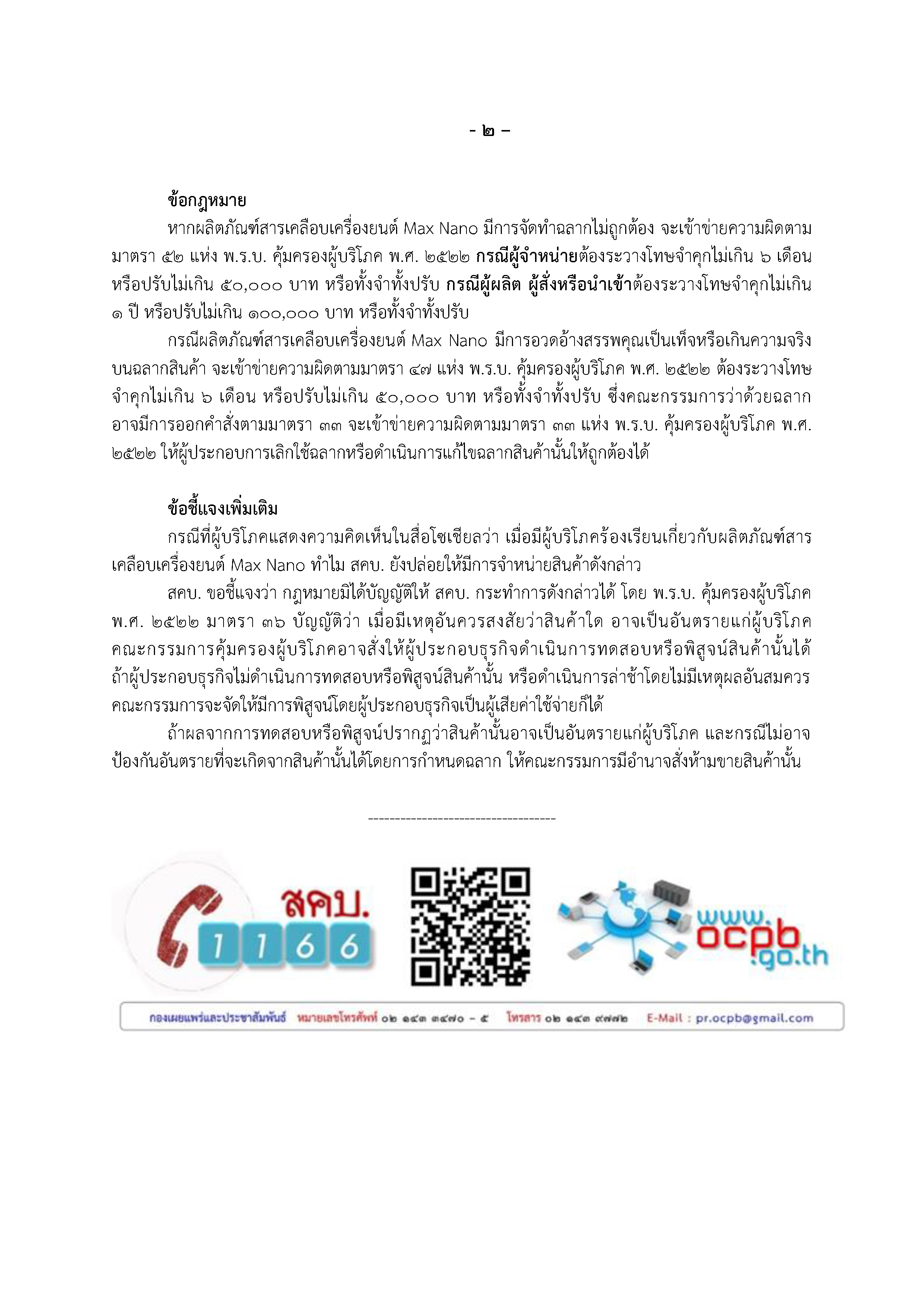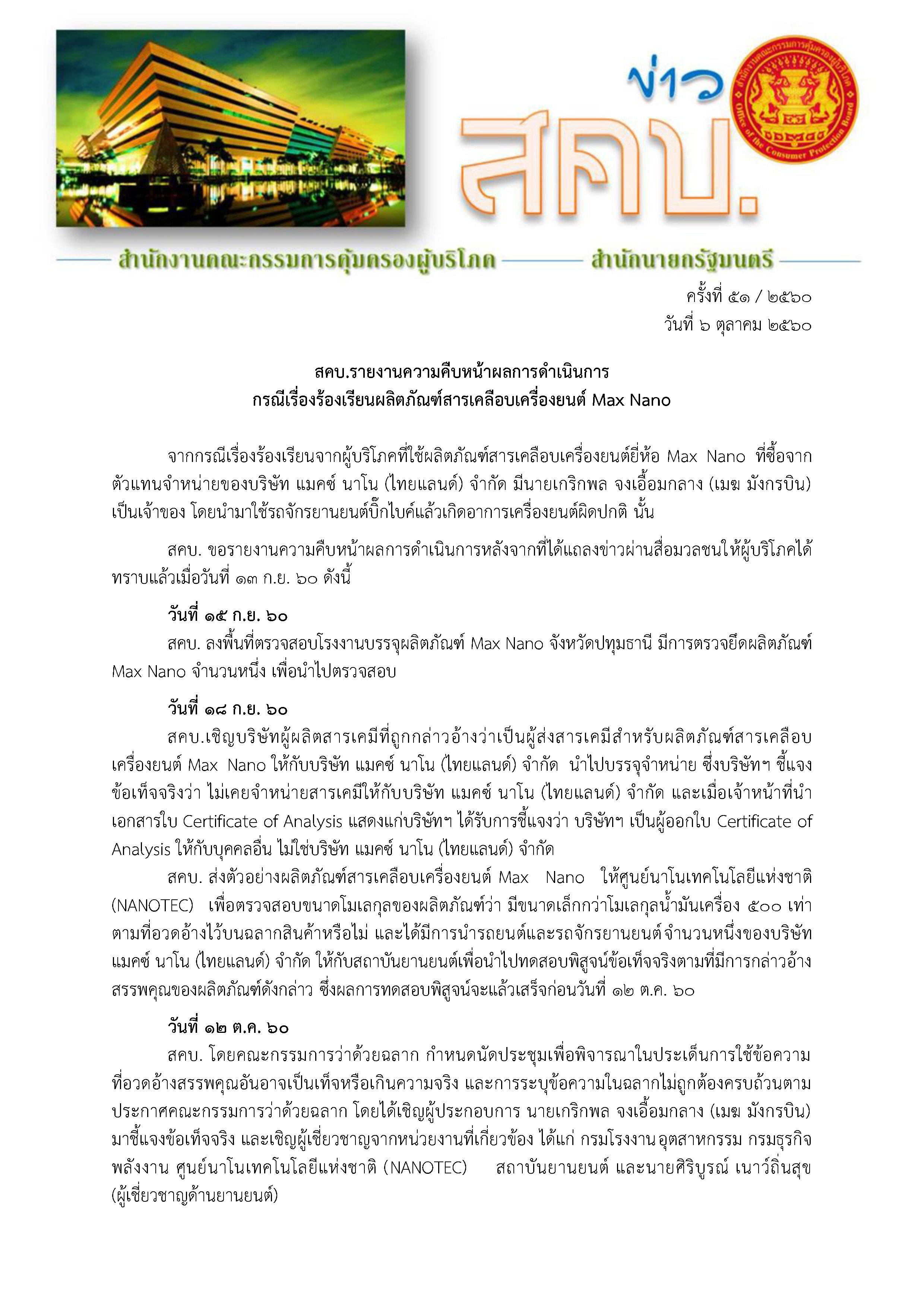 สคบ.รายงานความคืบหน้าผลการดำเนินการ กรณีเรื่องร้องเรียนผลิตภัณฑ์สารเคลือบเครื่องยนต์ Max Nano