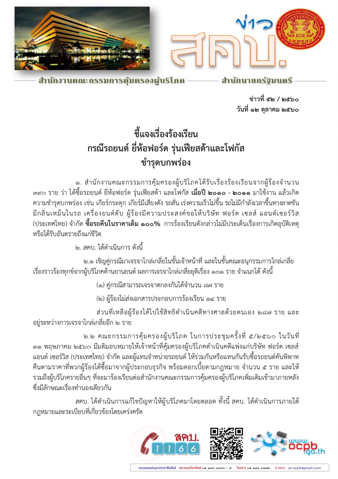 ชี้แจงเรื่องร้องเรียน กรณีรถยนต์ ยี่ห้อฟอร์ด รุ่นเฟียสต้าและโฟกัสชำรุดบกพร่อง