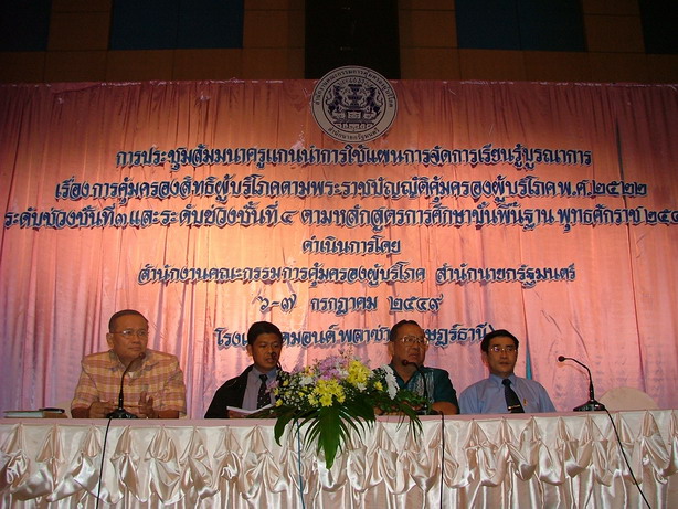 การประชุมสัมมนาครูแกนนำการใช้แผนการจัดการเรียนรู้บูรณาการ เรื่อง การคุ้มครองสิทธิผู้บริโภคตามพระราชบัญญัติคุ้มครองผู้บริโภค พ.ศ. 2522 ระดับช่วงชั้นที่ 3 และระดับช่วงชั้นที่ 4 ตามหลักสูตรการศึกษาขั้นพื้นฐาน พุทธศักราช 2544 เพื่อรณรงค์ให้เยาวชนและประชาชนในชุมชนมีส่วนร่วมในการคุ้มครองสิทธิผู้บริโภค ในโครงการรณรงค์ให้ประชาชนมีส่วนร่วมในการคุ้มครองสิทธิผู้บริโภค ของชมรมคุ้มครองผู้บริโภคในสถานศึกษาสู่ชุมชน ดำเนินการโดย สำนักงานคณะกรรมการคุ้มครองผู้บริโภค สำนักนายกรัฐมนตรี ในวันที่ 6-7 กรกฎาคม 2549 ณ โรงแรมไดมอนด์พลาซ่า อำเภอเมือง จังหวัดสุราษฎร์ธานี