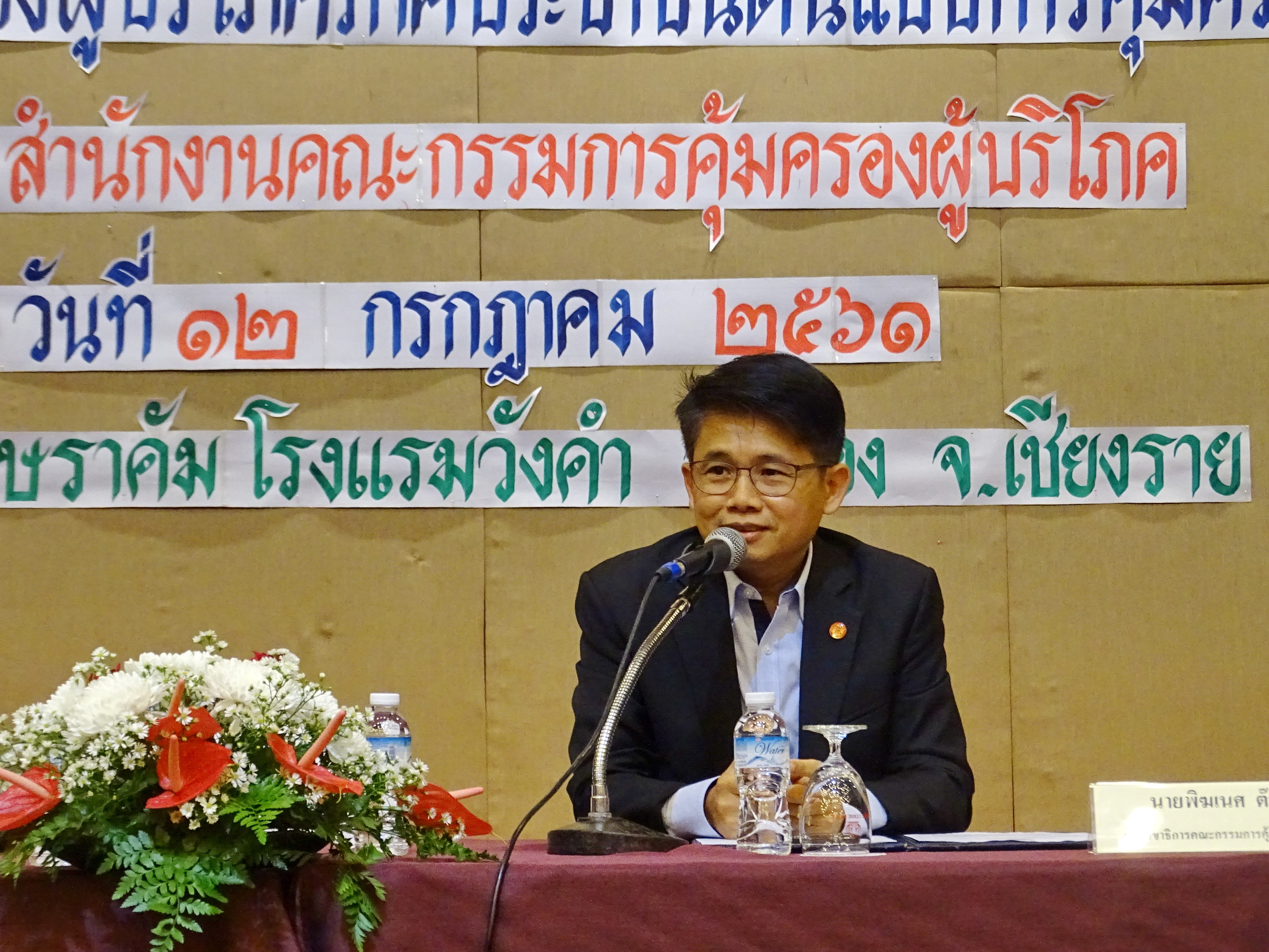 วันที่ 12 กรกฎาคม 2561 สำนักงานคณะกรรมการคุ้มครองผู้บริโภคจัดสัมมนา "โครงการชมรมคุ้มครองผู้บริโภคภาคประชาชนต้นแบบการคุ้มครองผู้บริโภค” ณ โรงแรมวังคำเชียงราย จังหวัดเชียงราย โดยมีนายพิฆเนศ ต๊ะปวง รองเลขาธิการคณะกรรมการคุ้มครองผู้บริโภค เป็นประธานเปิดโครงการ พร้อมด้วยคณะวิทยากรคือ นายวิทยา แจ่มกระจ่าง ประธานสมาพันธ์ชมรมคุ้มครองผู้บริโภคกรุงเทพ น.ส.เบญญาภา เมธาวราพร นักวิชาการเผยแพร่ชำนาญการพิเศษ น.ส อุไลภร กุสูงเนิน นิติกรชำนาญการ และน.ส.ดวงรัตน์ จันทร นักประชาสัมพันธ์ อภิปรายแนวทางการยื่นคำขอรับการรับรองสมาคมและมูลนิธิฯ รวมถึงแนวทางดำเนินการในส่วนต่างๆ ของ สคบ. เพื่อสร้างความเข้าใจที่ถูกต้องเกี่ยวกับการดำเนินการเครือข่าย ภาคประชาชน ซึ่งได้รับความร่วมมือจากเครือข่ายด้านการคุ้มครองผู้บริโภคจาก 11 อำเภอในพื้นที่ภาคเหนือเข้าร่วมสัมมนาจำนวนประมาณ 60 คน เพื่อนำข้อคิดเห็นและแนวทางที่ ได้มาพัฒนาการดำเนินงานเครือข่ายคุ้มครองผู้บริโภคให้มีประสิทธิภาพยิ่งขึ้นต่อไป
