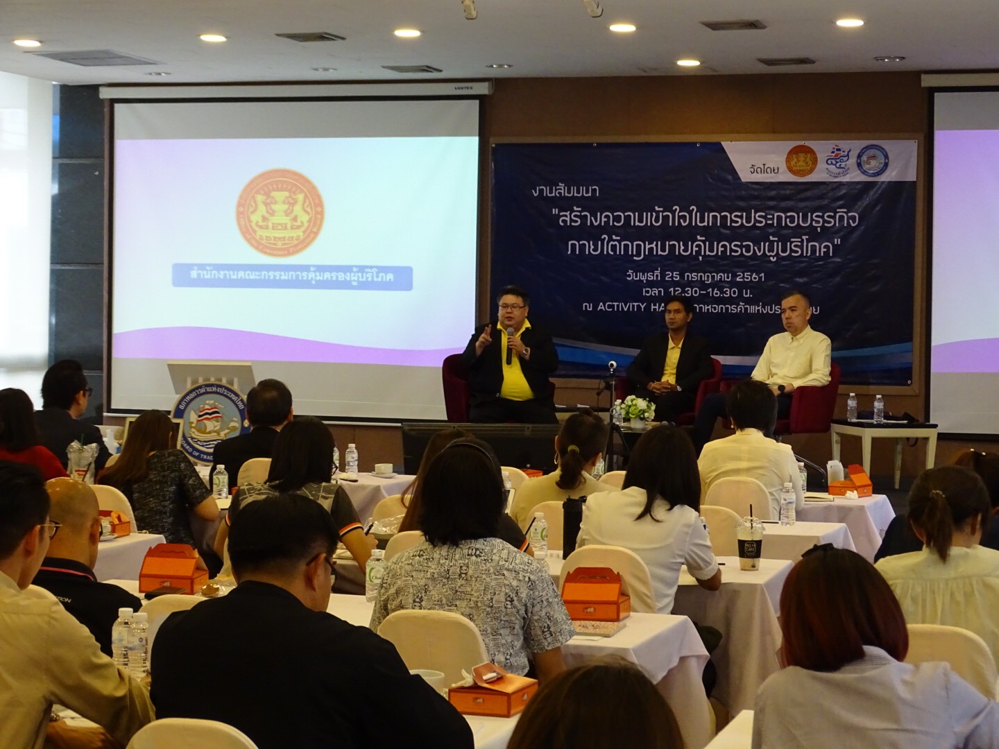 วัน 25 กรกฎาคม 2561 นายพิฆเนศ ต๊ะปวง รองเลขาธิการคณะกรรมการคุ้มครองผู้บริโภค เป็นประธานในพิธีเปิด "การประชุมสัมมนาสร้างความเข้าใจในการประกอบธุรกิจภายใต้กฎหมายคุ้มครองผู้บริโภค” พร้อมด้วยนายสนั่น อังอุบลกุล รองประธานกรรมการสภาหอการค้าแห่งประเทศไทย และ ดร.โฆสิต สุวินิจจิต ประธานคณะกรรมการสมาคมการค้ากลุ่มบันเทิงและการสื่อสาร ณ ห้อง Activity Hall อาคารบรรเจิด ชลวิจารณ์ สภาหอการค้าแห่งประเทศไทย การสัมมนาในวันนี้ประกอบด้วยผู้ประกอบธุรกิจที่เป็นสมาชิกของสภาหอการค้าแห่งประเทศไทยประมาณ 100 คน นับเป็นอีกก้าวที่สำคัญของการขับเคลื่อนความร่วมมือด้านการคุ้มครองผู้บริโภคให้เกิดขึ้นระหว่าง สคบ. กับผู้ประกอบธุรกิจ