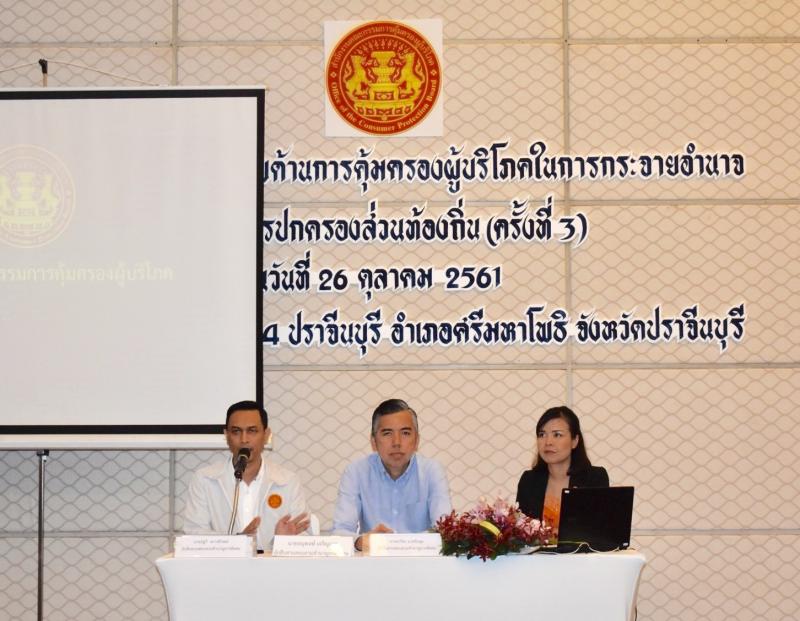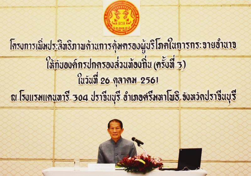 วันที่ 26 ตุลาคม 2561 สำนักงานคณะกรรมการคุ้มครองผู้บริโภค โดยสำนักประสานและส่งเสริมการคุ้มครองผู้บริโภคจังหวัด จัดโครงการเพิ่มประสิทธิภาพด้านการคุ้มครองผู้บริโภคในการกระจายอำนาจให้กับองค์กรปกครองส่วนท้องถิ่น (ครั้งที่ 3) โดยมีนายพิบูลย์ หัตถกิจโกศล ผู้ว่าราชการจังหวัดปราจีนบุรี เป็นประธานในพิธีเปิด ทั้งนี้นายพิฆเนศ ต๊ะปวง รองเลขาธิการคณะกรรมการคุ้มครองผู้บริโภค เป็นวิทยากรบรรยายในหัวข้อ "บทบาทและอำนาจหน้าที่ของสำนักงานคณะกรรมการคุ้มครองผู้บริโภค” ณ โรงแรมแคนทารี 304 ปราจีนบุรี อำเภอเมือง จังหวัดปราจีนบุรี ในวันเดียวกันเจ้าหน้าที่ สคบ. ส่วนกลาง และส่วนภูมิภาค ร่วมลงพื้นที่ให้คำแนะนำแก่ผู้ประกอบธุรกิจจำหน่ายรถยนต์ใช้แล้ว และผู้ประกอบธุรกิจจำหน่ายทองรูปพรรณ กำชับให้ปฏิบัติให้ไปเป็นตามประกาศคณะกรรมการว่าด้วยฉลากฯ ในอำเภอเมือง จังหวัดปราจีนบุรี