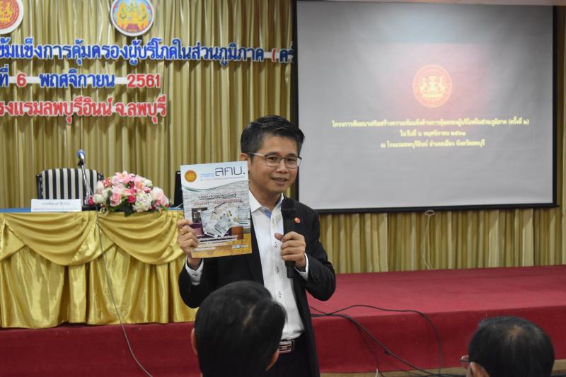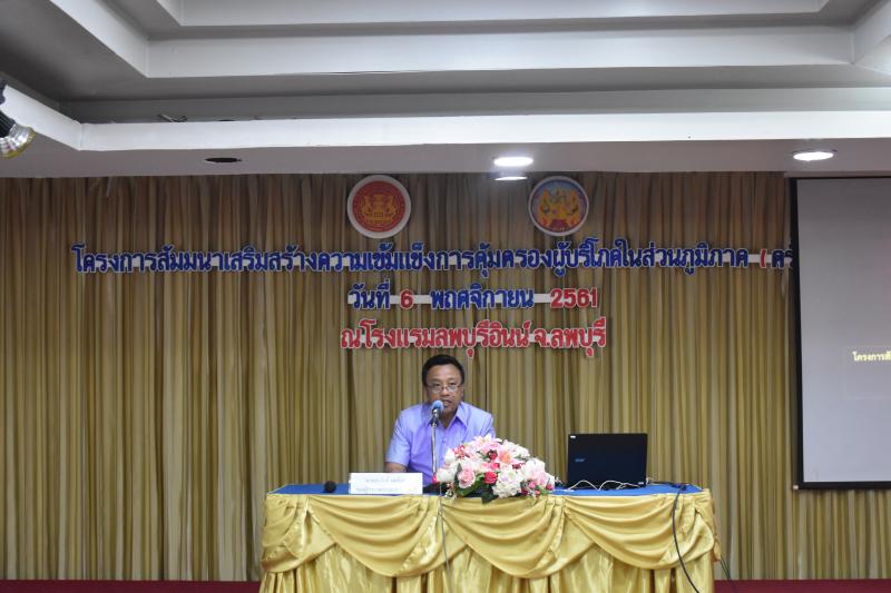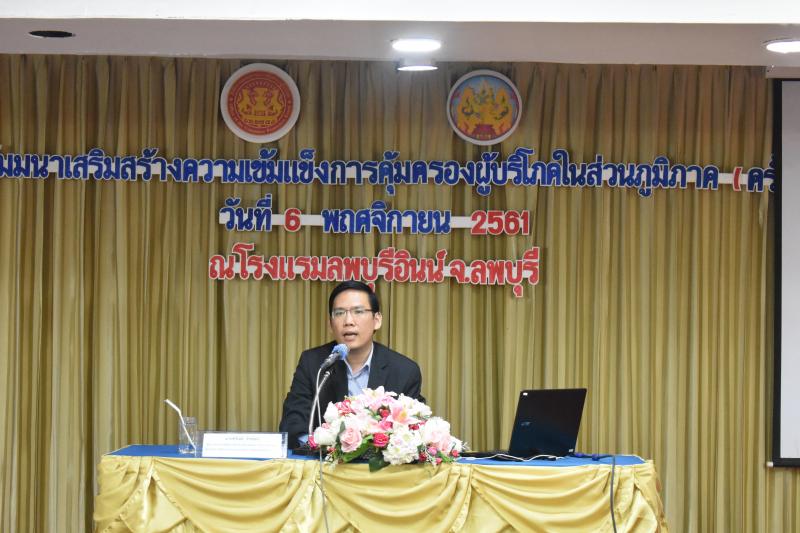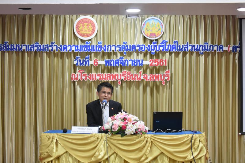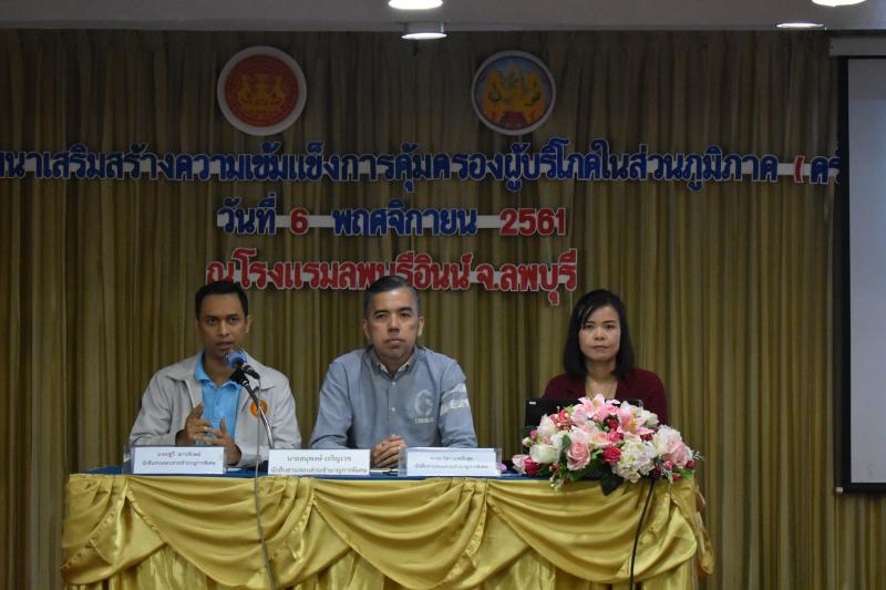 วันที่ 6 พฤศจิกายน 2561 สำนักประสานและส่งเสริมการคุ้มครองผู้บริโภคจังหวัด จัดโครงการสัมมนาเสริมสร้างความเข้มแข็งด้านการคุ้มครองผู้บริโภคในส่วนภูมิภาค (ครั้งที่ 2) โดยมีนายสุรศักดิ์ ผลยังส่ง รองผู้ว่าราชการจังหวัดลพบุรี เป็นประธานในพิธีเปิดโครงการฯ พร้อมทั้ง นายพิฆเนศ ต๊ะปวง รองเลขาธิการคณะกรรมการคุ้มครองผู้บริโภค บรรยายเรื่อง "บทบาท และอำนาจหน้าที่ของสำนักงานคณะกรรมการคุ้มครองผู้บริโภค” โดยมีผู้เข้าร่วมโครงการประชุมสัมมนาฯ ประมาณ 150 คน ณ โรงแรมลพบุรีอินน์ อำเภอเมือง จังหวัดลพบุรี