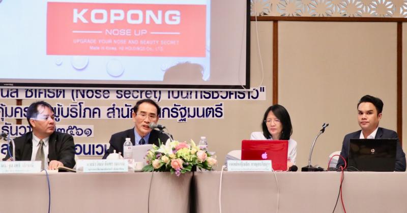 วันศุกร์ที่ 21 ธันวาคม 2561 เลขาธิการคณะกรรมการคุ้มครองผู้บริโภคมอบหมายให้ นายพิฆเนศ ต๊ะปวง รองเลขาธิการคณะกรรมการคุ้มครองผู้บริโภค เป็นประธานในพิธีเปิดการประชุมสัมมนาโครงการ "รับฟังความคิดเห็นร่างคำสั่งคณะกรรมการคุ้มครองผู้บริโภค เรื่อง ห้ามขายสินค้าอุปกรณ์เสริมจมูก โนส ซีเคร็ต (Nose secret) เป็นการชั่วคราว” ณ โรงแรม ทีเค พาเลซ แอนด์ คอนเวนชั่น แจ้งวัฒนะ กรุงเทพฯ ภายในงานมีการอภิปรายในหัวข้อ "การจัดทำร่างคำสั่งคณะกรรมการคุ้มครองผู้บริโภค เรื่อง ห้ามขายสินค้าอุปกรณ์เสริมจมูก โนส ซีเคร็ต (Nose secret) เป็นการชั่วคราว” และมีการรับฟังความคิดเห็นจากผู้มีส่วนได้ส่วนเสียจากการจัดทำคำสั่งดังกล่าว วิทยากรโดยนายธีรวัฒน์ จันทรสมบูรณ์ อนุกรรมการพิจารณากลั่นกรองสินค้าและบริการที่อาจเป็นอันตรายแก่ผู้บริโภค แพทย์หญิงเล็ก กาญจนโกมุท แพทย์ผู้เชี่ยวชาญด้านศัลยกรรมตกแต่งสมาคมศัลยแพทย์ตกแต่งเสริมสวยแห่งประเทศไทย นายฐิตินันท์ สิงหา ผู้อำนวยการกองคุ้มครองผู้บริโภค ด้านฉลาก นายภูมินทร์ เล็กมณี นักสืบสวนสอบสวนชำนาญการ และนายจิรายุ เพ็งพะยอม เจ้าหน้าที่ประสานงานต่างประเทศ วิทยากรและผู้ดำเนินรายการ